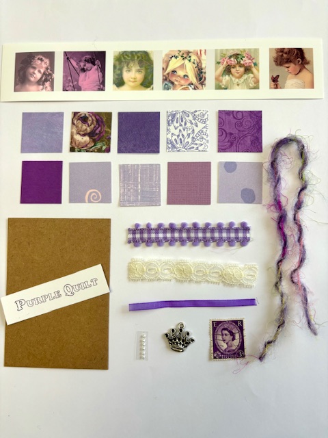 Artist Trading Card Kit of the Month - November 2024. Here is our Artist Trading Card kit for November. Create a patchwork quilt with the images and paper pieces included in this kit. Start with the chipboard ATC base included in the kit. Then start at the left top corner and hang one 1" square paper or photo of your choice over the top and left side of the card. Continue lining up another 1" square piece, as so on, until you have your ATC covered with the square pieces. Then one by one glue them onto the base. Once dry, turn your ATC over and cut the paper off that is hanging off the edges of the ATC so your ATC will measure 2 1/2 x 3 1/2 inches. Embellish your ATC with the other items included in your kit to complete your ATC. Here is what is included in this kit: 1 - 2 1/2 in. x 3 1/2 in. kraft chipboard ATC, 10 - different 1 in. x 1 in. pieces of purple themed paper and Bazzill cardstock, 6 - differtnt 1 in. x 1 in. images chosen from my library of images that coordinate this kit and has been professionally printed, 1 - "purple quilt" phrase with purple ink that has been professionally printed, 1 - silver crown charm, 1 - piece of purple varigated fiber yarn, 1 - 1/8 in. piece of ribbon - purple, 1 - piece of ribbon - lavender purple, 1 - vintage piece of lace - cream patterned lace, 1 - purple themed cancelled postage stamp that has been removed from an envelope, 6 - tiny cream pearl flatback gems in a strip that can be cut apart and used separately. Lastly 1 - Clear ATC sleeve (not pictured).