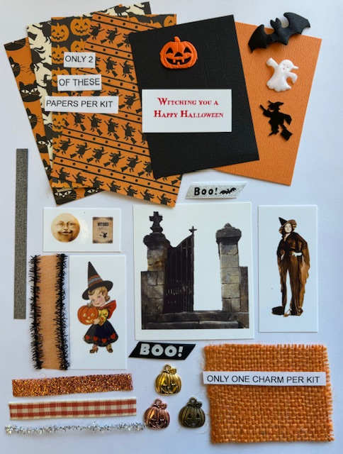 Artist Trading Card Kit of the Month - October 2024 Halloween Cemetery. This is what is included in this kit: 2 - 3 in. x 4 in. piece of There are 4 different ones shown in the photo. Two will randomly be chosen. 1 - 2 1/2 in. x 3 1/2 in. ATC cut from Bazzill cardstock - Black, 1 - 2 1/2 in. x 3 1/2 in. ATC cut from Bazzill cardstock - Orange, 1 - cut piece of orange burlap, 5 - collage images that I created for this kit. A cemetery scene, 2 different witches, a man in the moon, miniature Witch book. I included 2 different witches for this kit. You can decide which one you would like to cut out and glue at the opening of the gate of the cemetery. You can then cut and glue the moon, 1 - collage phrase that says, "Witching you a Happy Halloween" in orange ink, 1 - ribbon piece that says, Boo! with a bat, 1 - black ribbon piece that says, "BOO!", 1 - ribbon piece orange and cream checkered, 1 - ribbon orange glitter piece, 1 - sheer ribbon piece trimmed in black tinsel, 1 - thin tinsel silver wired piece ,3 - satin pillow ribbon pieces. A bat, orange pumpkin, and a white ghost, 1 - black flying witch sequin. Glue this in the sky by the moon if you like. 1 - pumpkin charm. There are 3 different ones shown in the photo (gold, copper, bronze). One will be randomly chosen.